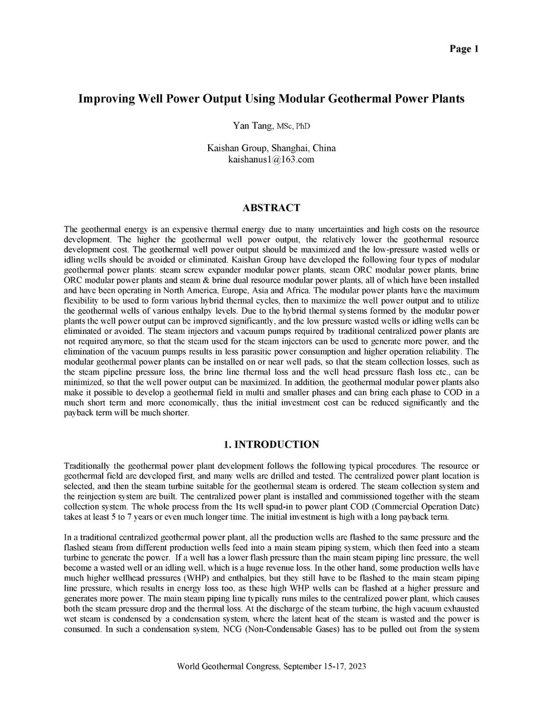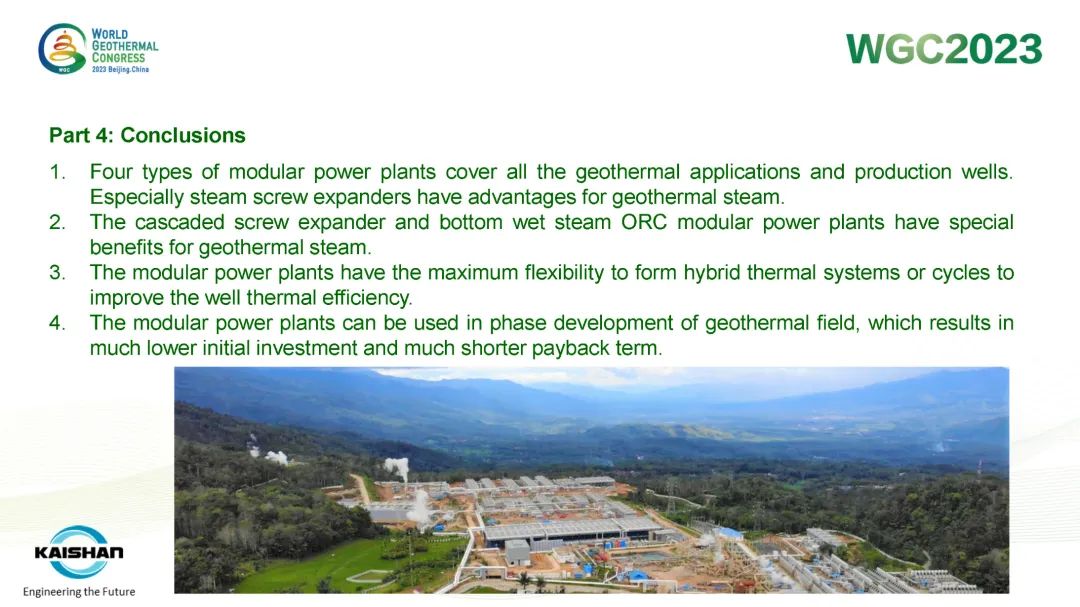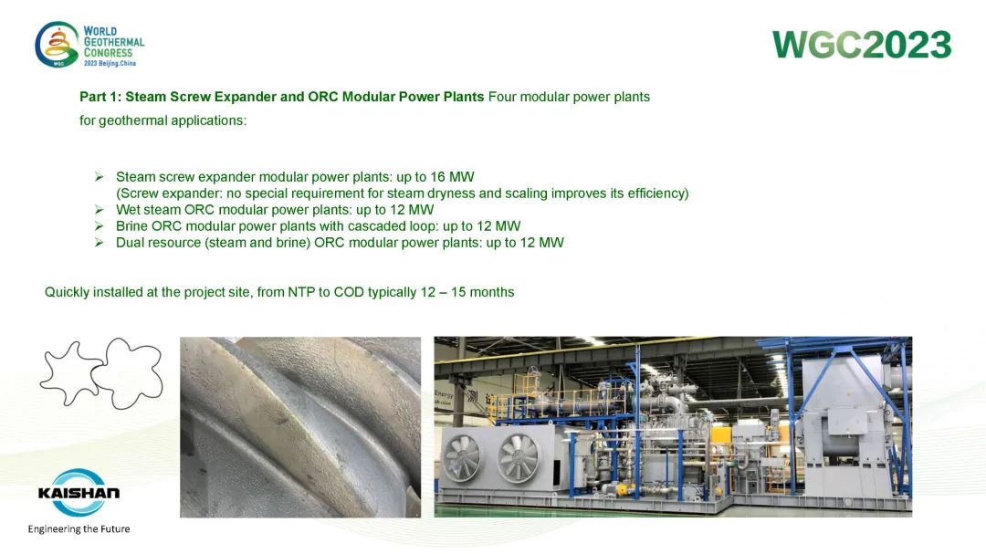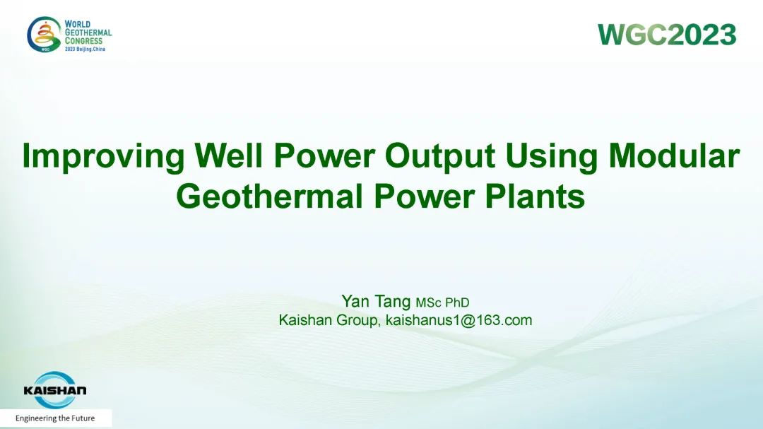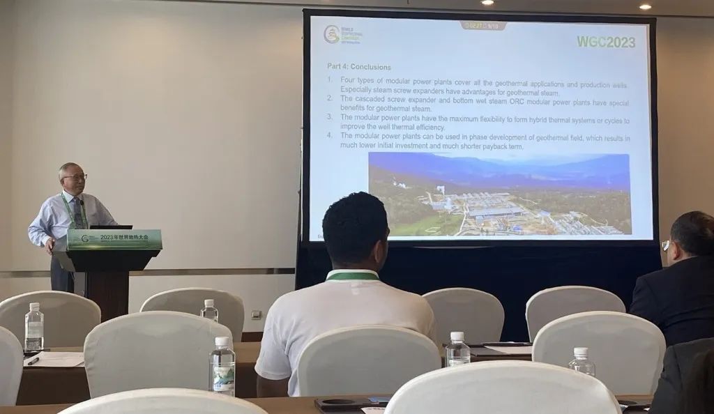 9月16日,公司總經(jīng)理、開山地?zé)峋谀K發(fā)電技術(shù)創(chuàng)始人湯炎博士參加2023年北京世界地?zé)岽髸╓GC),并受國際地?zé)釁f(xié)會(IGA)首席執(zhí)行官Marit Brommer女士邀請,做了題為《使用地?zé)崮K電站提高地?zé)峋a(chǎn)量》(Improving Well Power Output Using Modular Geothermal Power Plants)的專題報告。
