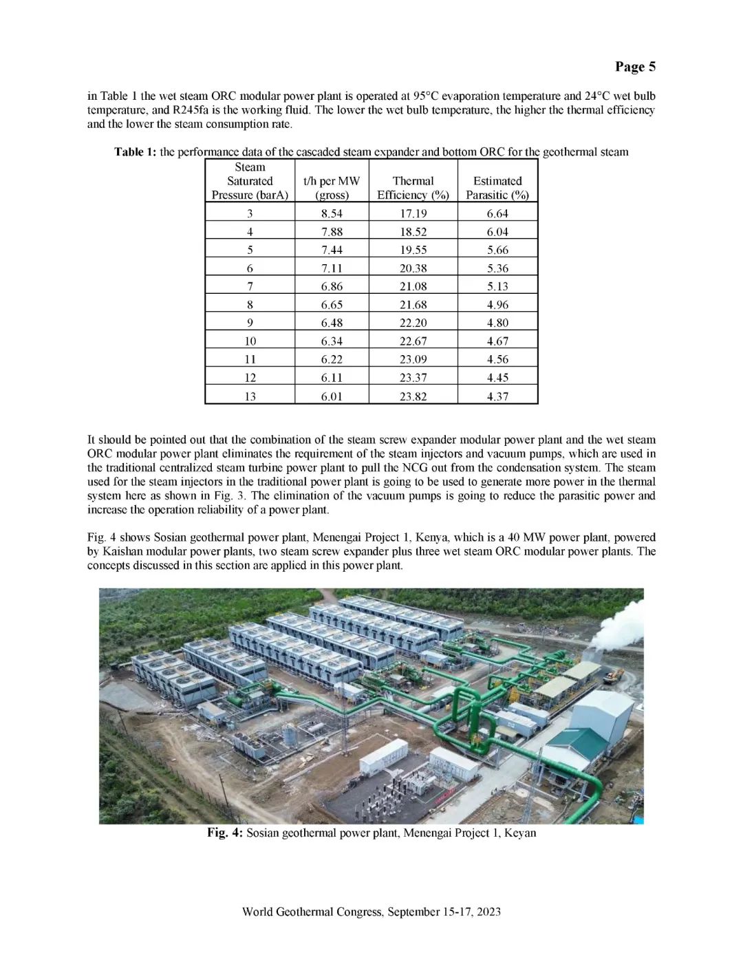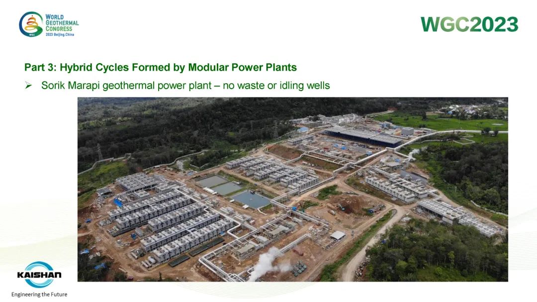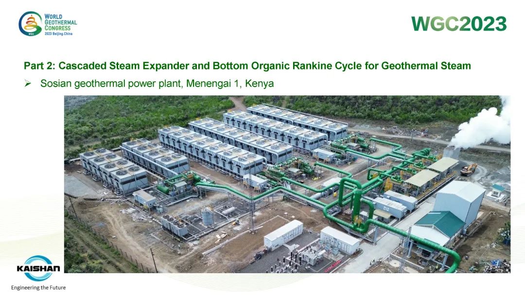 湯炎博士著重介紹了由開山EPC建設(shè)的肯尼亞Sosian-Menengai地?zé)犭娬炯伴_山自主開發(fā)、建設(shè)、運營的Sorik Marapi地?zé)犭娬境晒Π咐osian-Menengai地?zé)犭娬静捎谩罢羝蛎洐C+濕蒸汽ORC膨脹機”模塊電站串級循環(huán),無需采用傳統(tǒng)中央電站分離不凝性氣體的蒸汽噴射器和真空泵,從而降低了電站寄生負荷、提高其發(fā)電效率。Sorik Marapi項目是公司各類型模塊電站的集大成者,高壓蒸汽井、低壓蒸汽井、熱水井熱源均可得到充分利用,進而使項目實現(xiàn)“無閑置低壓/低溫井”。模塊電站“量體裁衣”式的解決方案通過提高井熱效率改善了地?zé)衢_發(fā)的經(jīng)濟性,也通過獨樹一幟地有效利用低壓地?zé)峋盁崴@著降低了資源鉆探的單位成本。