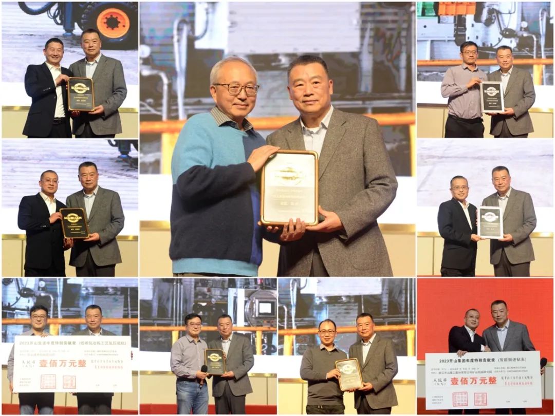 今年年會(huì)的重頭戲是首次頒發(fā)的特別貢獻(xiàn)獎(jiǎng)。今年的創(chuàng)新特別貢獻(xiàn)獎(jiǎng)分別授予了開山重工集團(tuán)股份有限公司研究院研制的智能掘進(jìn)鉆車和開山通用機(jī)械研究院研制的低碳?xì)湟睙捁に嚉鋲嚎s機(jī),這兩項(xiàng)科研成果在國(guó)內(nèi)市場(chǎng)創(chuàng)造了較好的經(jīng)濟(jì)效益和社會(huì)效益。集團(tuán)委托上海造幣廠特制的純金獎(jiǎng)牌頒發(fā)給了湯炎博士以及夏劍輝、徐雪峰、惠登峰、田兵兵等四位高級(jí)工程師;另有純銀獎(jiǎng)牌頒發(fā)給了技術(shù)團(tuán)隊(duì)參與兩項(xiàng)創(chuàng)新產(chǎn)品開發(fā)的工程技術(shù)人員。